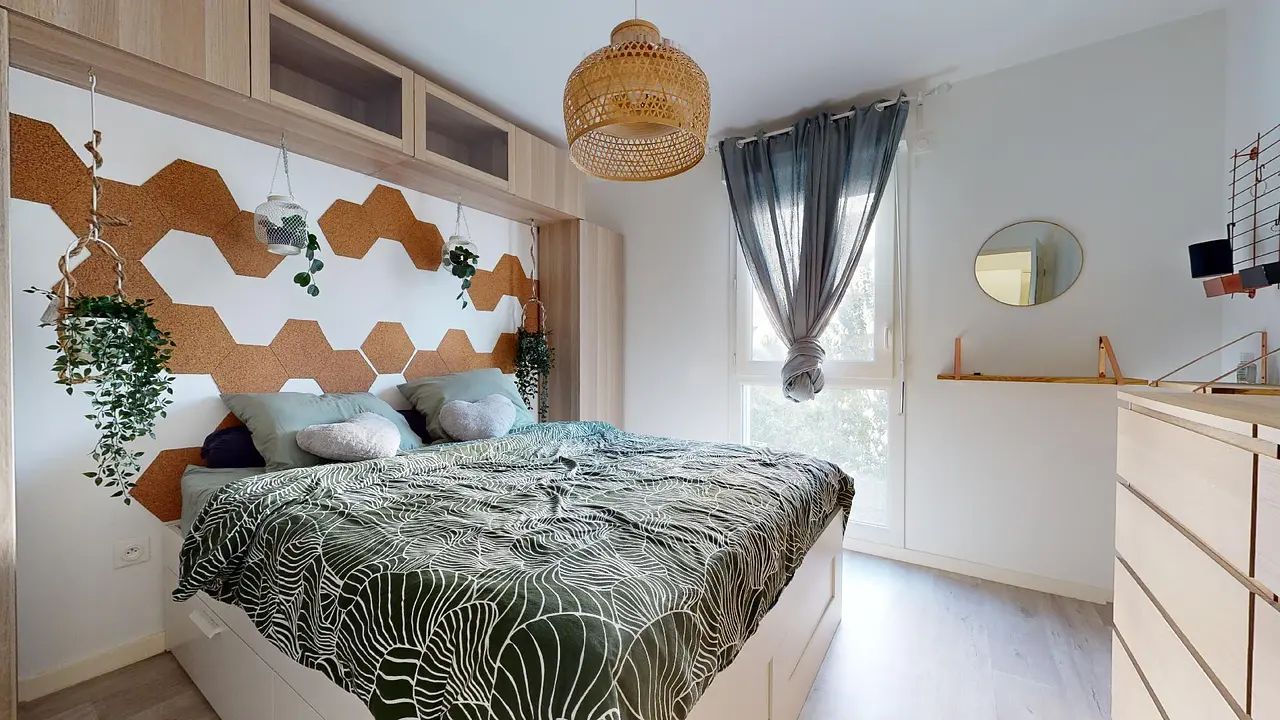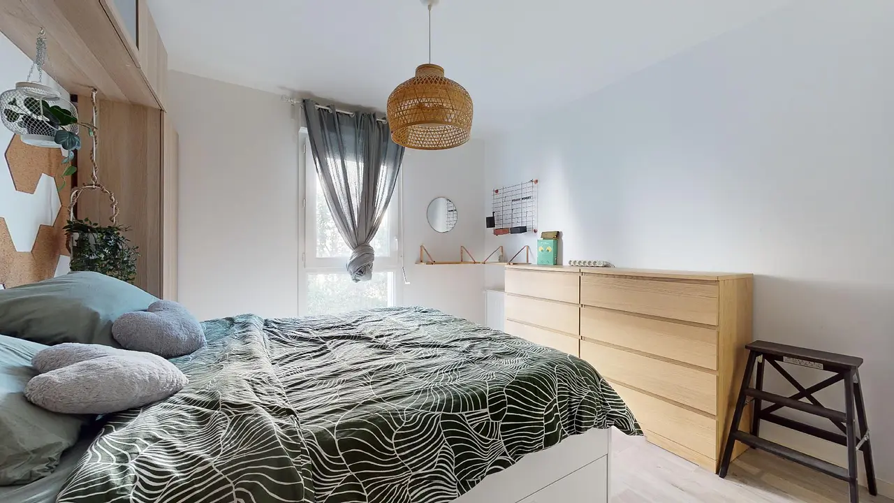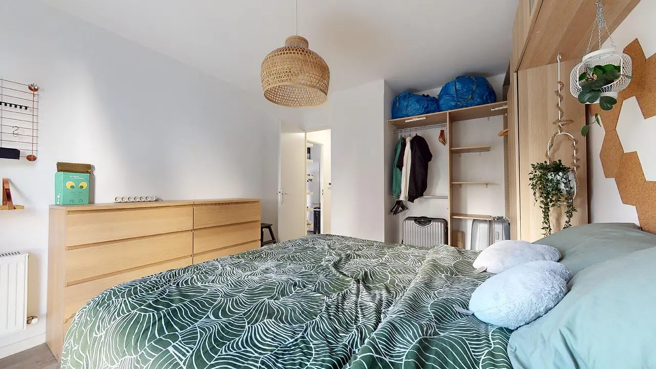 La chambre, séparée du reste de l'appartement, est agencée de manière optimale avec un lit double doté d'un sommier intégrant des espaces de rangement, un dressing, ainsi qu'une commode. Enfin, la salle d'eau est pourvue d'une élégante douche, de toilettes et d'un sèche-serviette.