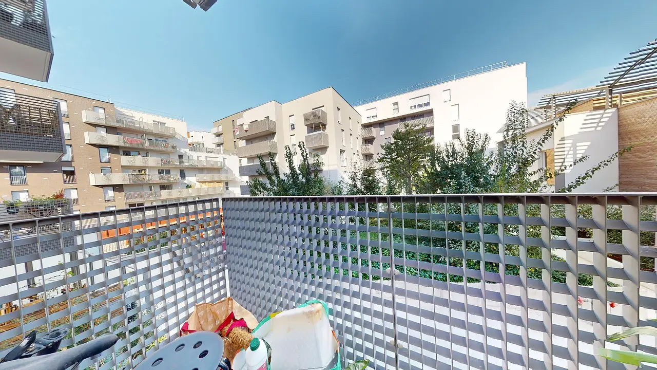 L'appartement offre une spacieuse pièce de vie comprenant un coin salon qui s'ouvre sur un balcon, ainsi qu'une cuisine ouverte. Le salon est aménagé avec un canapé en angle, une télévision à écran plat fixée au mur, et une table basse. Le balcon offre une vue sur l'espace commun de la copropriété.