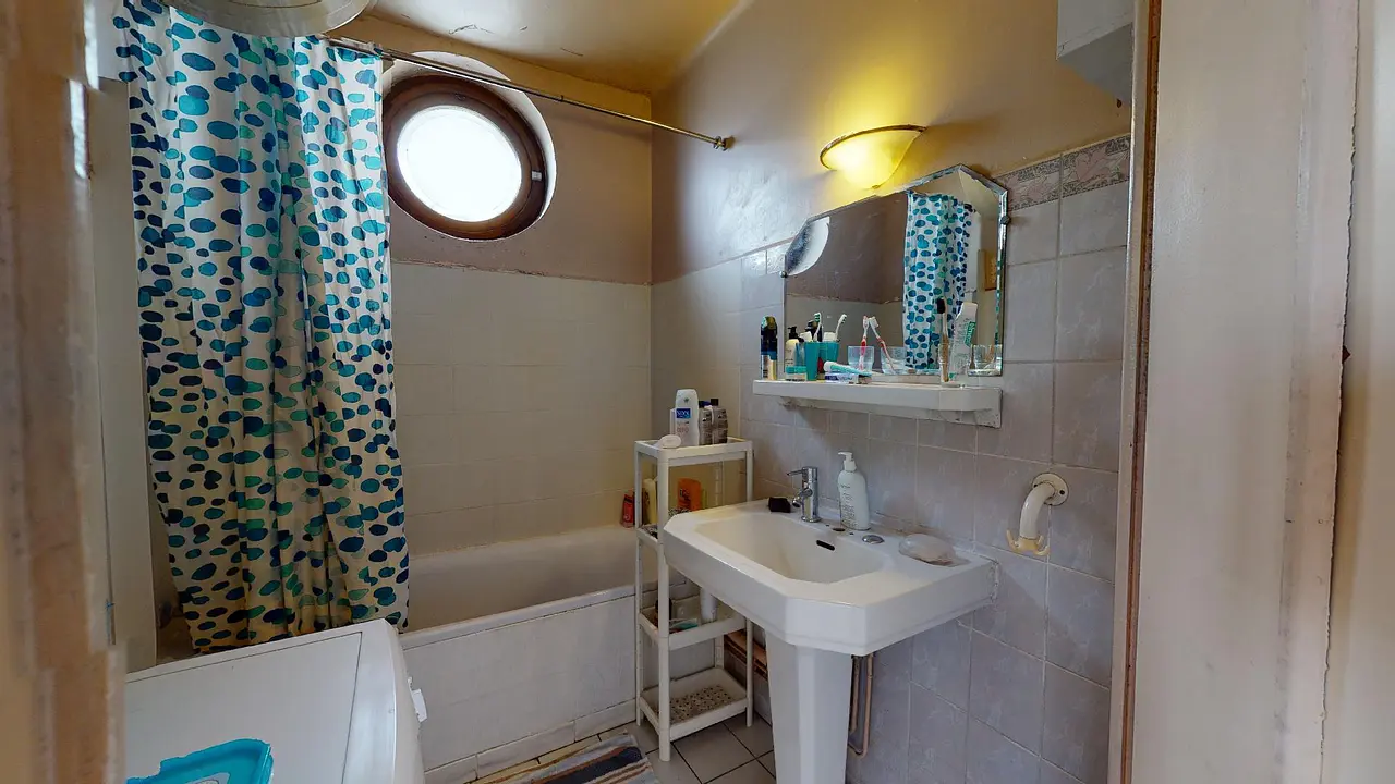 Une salle de bain avec baignoire, meuble vasque et machine à laver ainsi que des WC séparés viennent compléter ce logement.