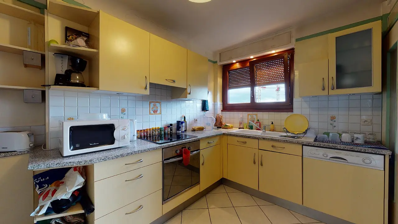 La cuisine est entièrement équipée et fonctionnelle : frigo, plaques de cuisson, four, machine à café, rangements, etc.