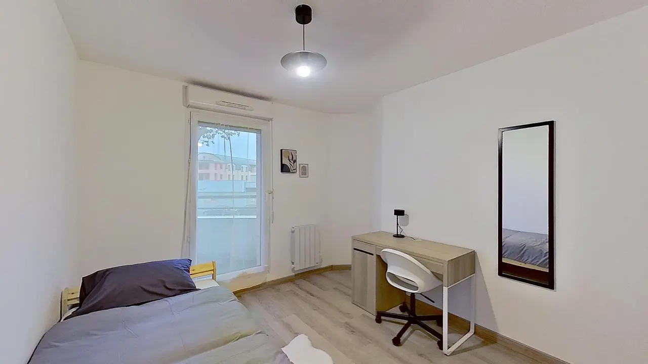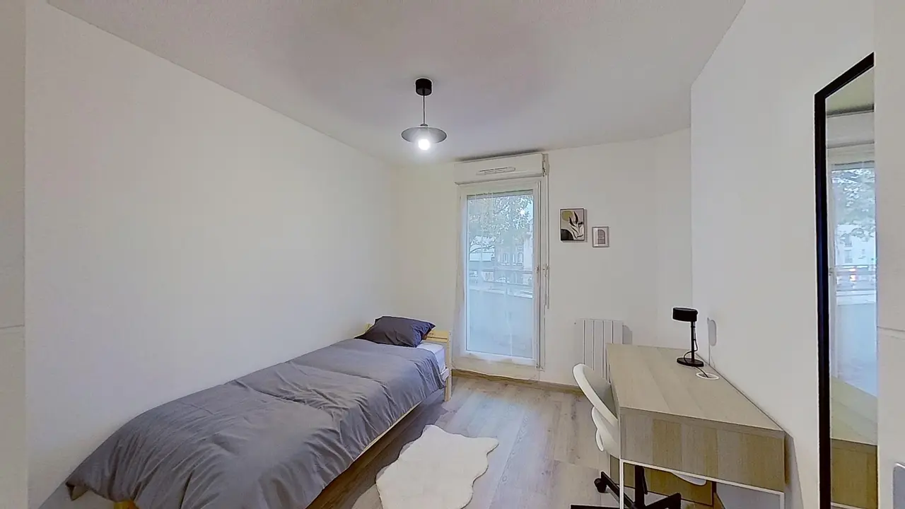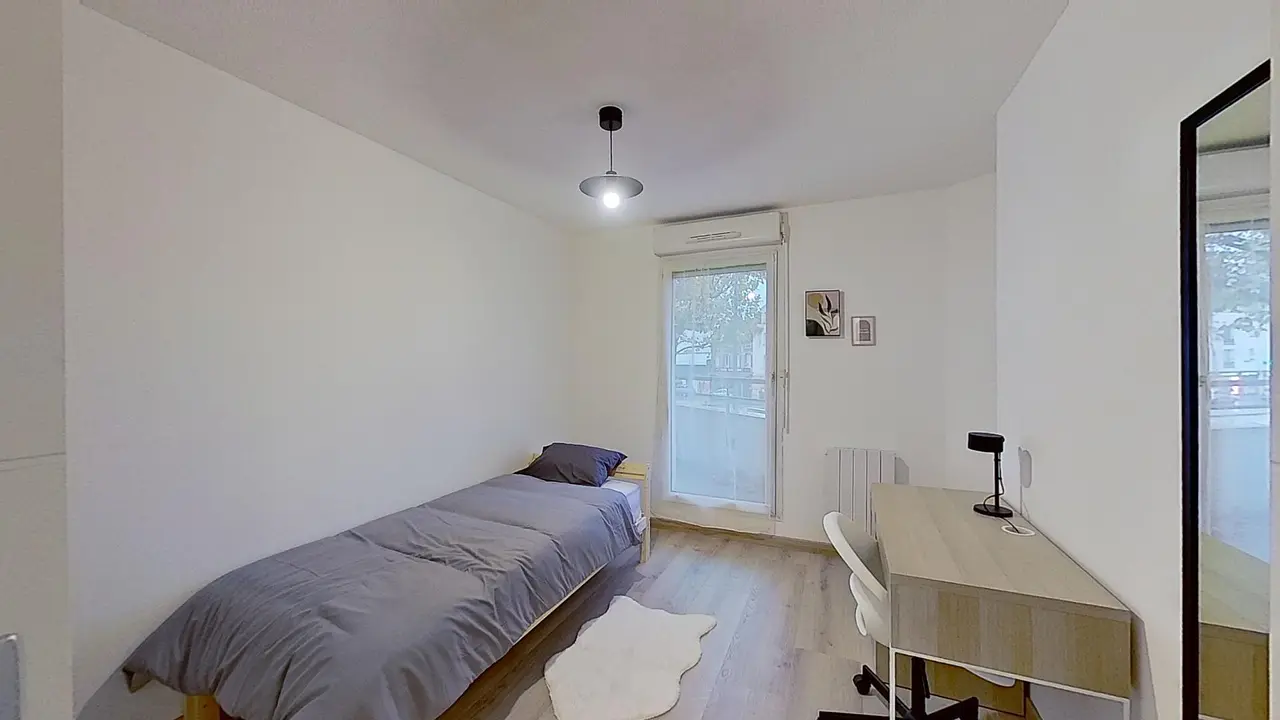 La chambre est équipée d'un lit simple, d'une table de nuit, d'un bureau et un placard.