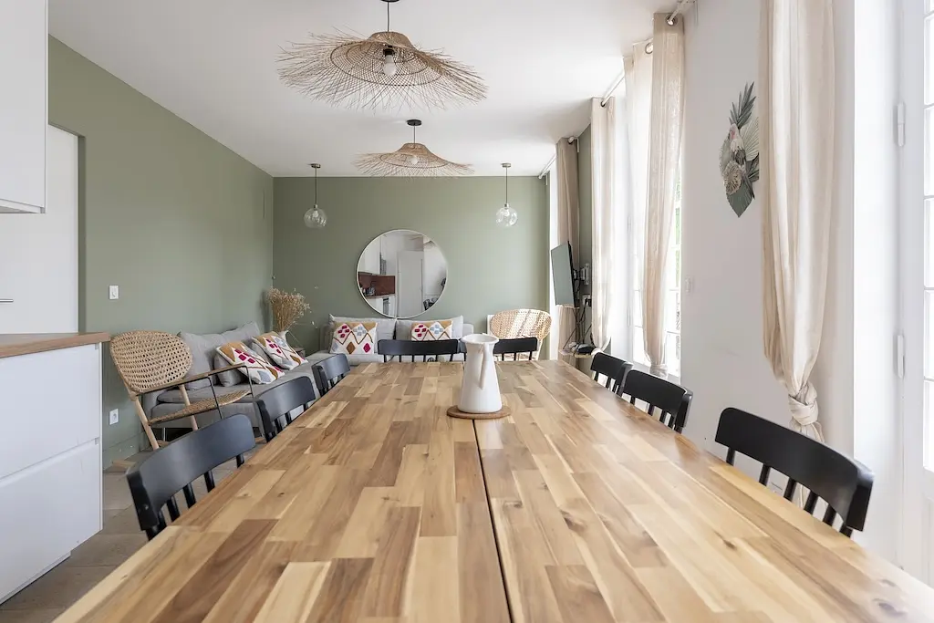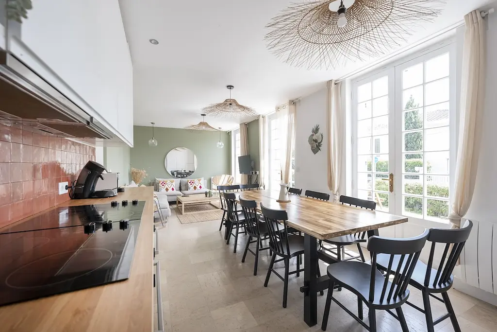La maison pour 10 belles chambres comprend une cuisine entièrement équipée (table pour 10 pers, plaque XXL, 2 fours, plusieurs réfrigérateurs, congélateur, lave-vaisselle), un séjour/salon, 4 WC, une buanderie avec 2 lave-linge/sèche-linge, une grande table de repas extérieur dans le jardin. Toutes les pièces communes donnent sur le jardin !
