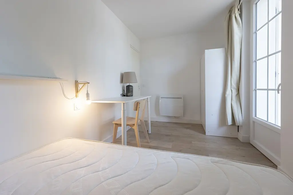 Cette chambre dispose d'un lit double, d'un bureau avec une chaise et une lampe ainsi qu'une armoire. La salle d'eau au fond du couloir est partagée avec la chambre 5.
