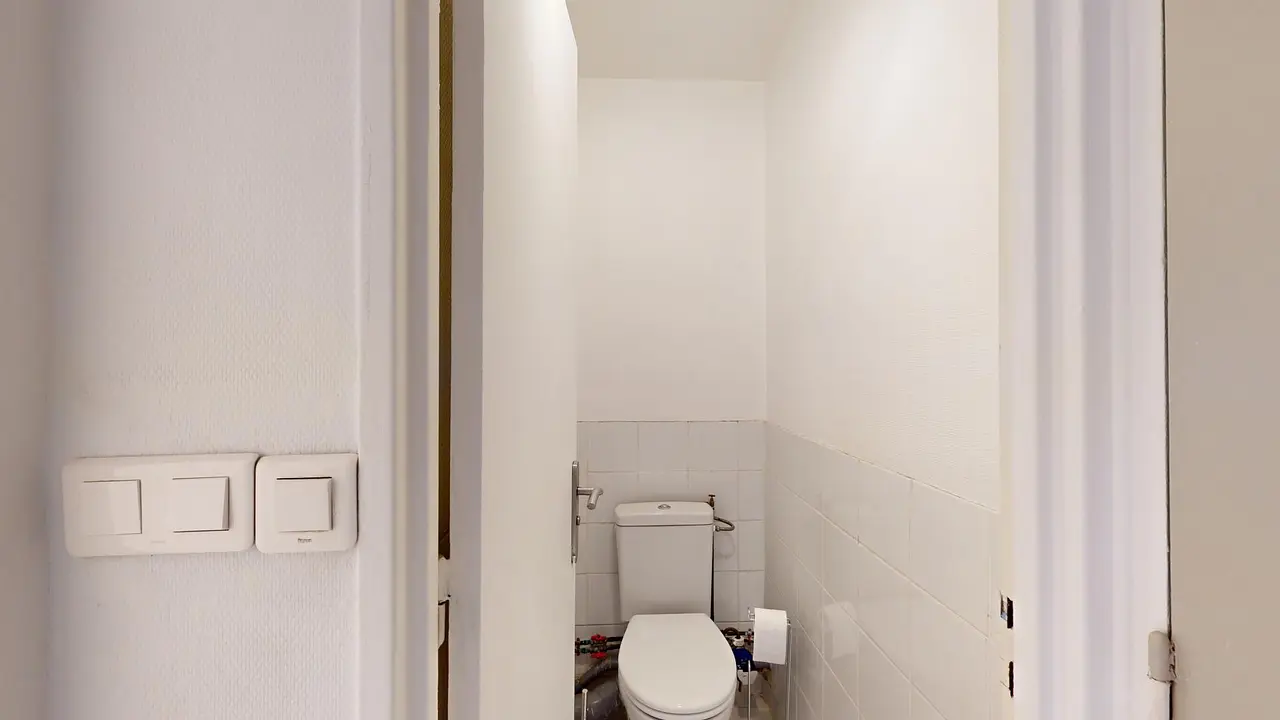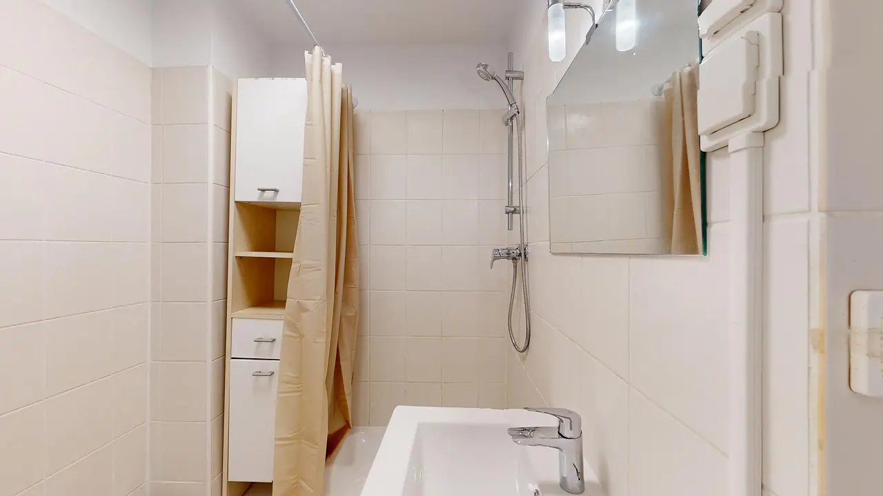 Une salle d'eau avec meuble vasque, douche. Les WC sont séparés.
