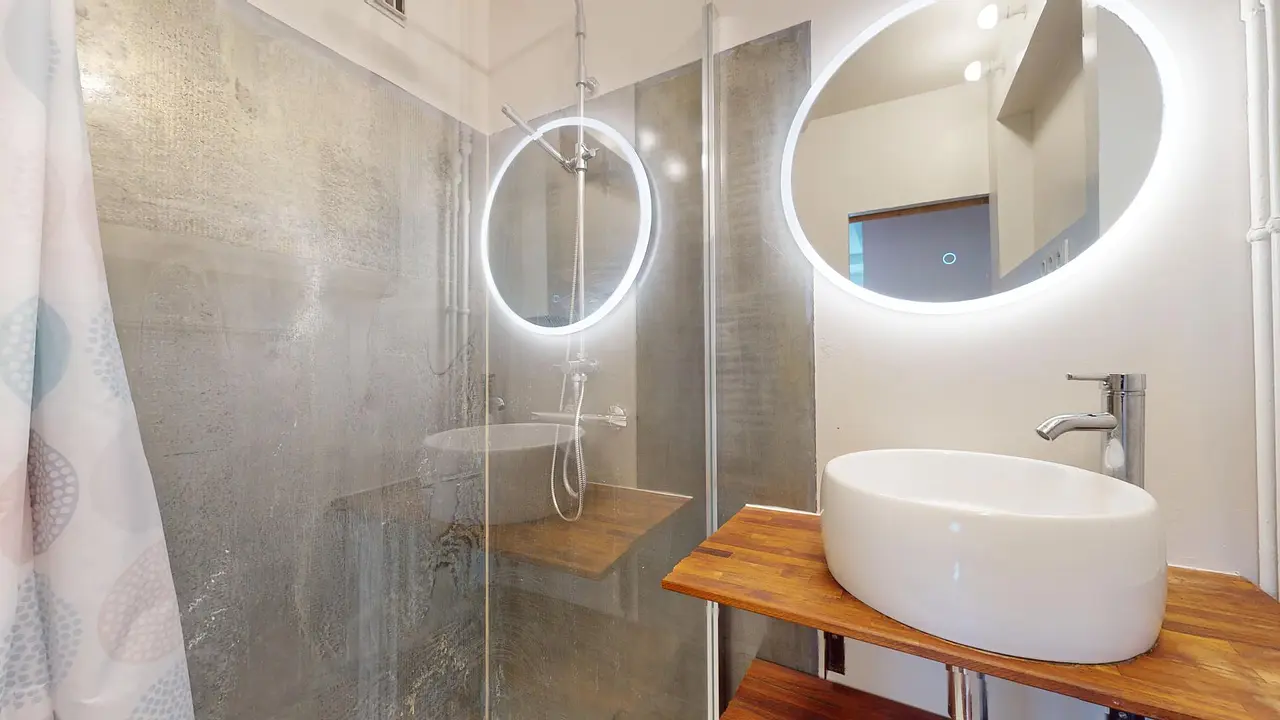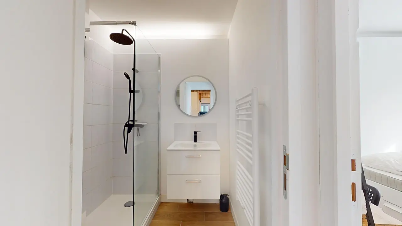 L'appartement dispose de deux salles d'eau disposant d'une grande douche, d'un porte-serviettes radiateur ainsi que d'un meuble vasque avec un miroir lumineux.