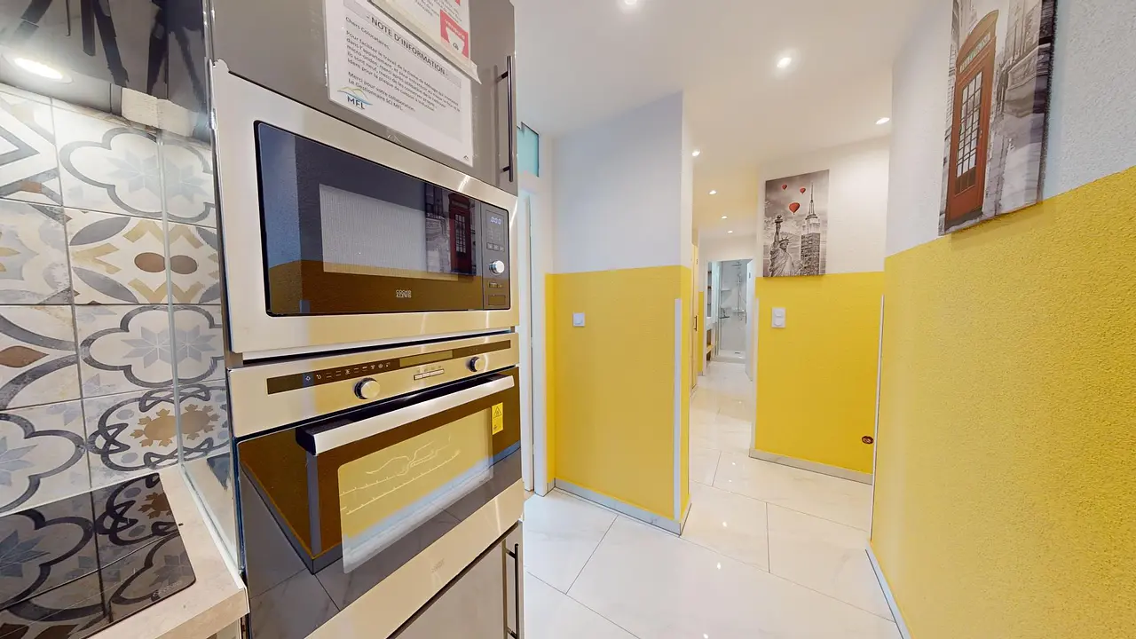 Cet appartement se compose d'une cuisine entièrement équipée et fonctionnelle : plaques de cuisson, four, hotte, rangements, frigidaire américain, etc.