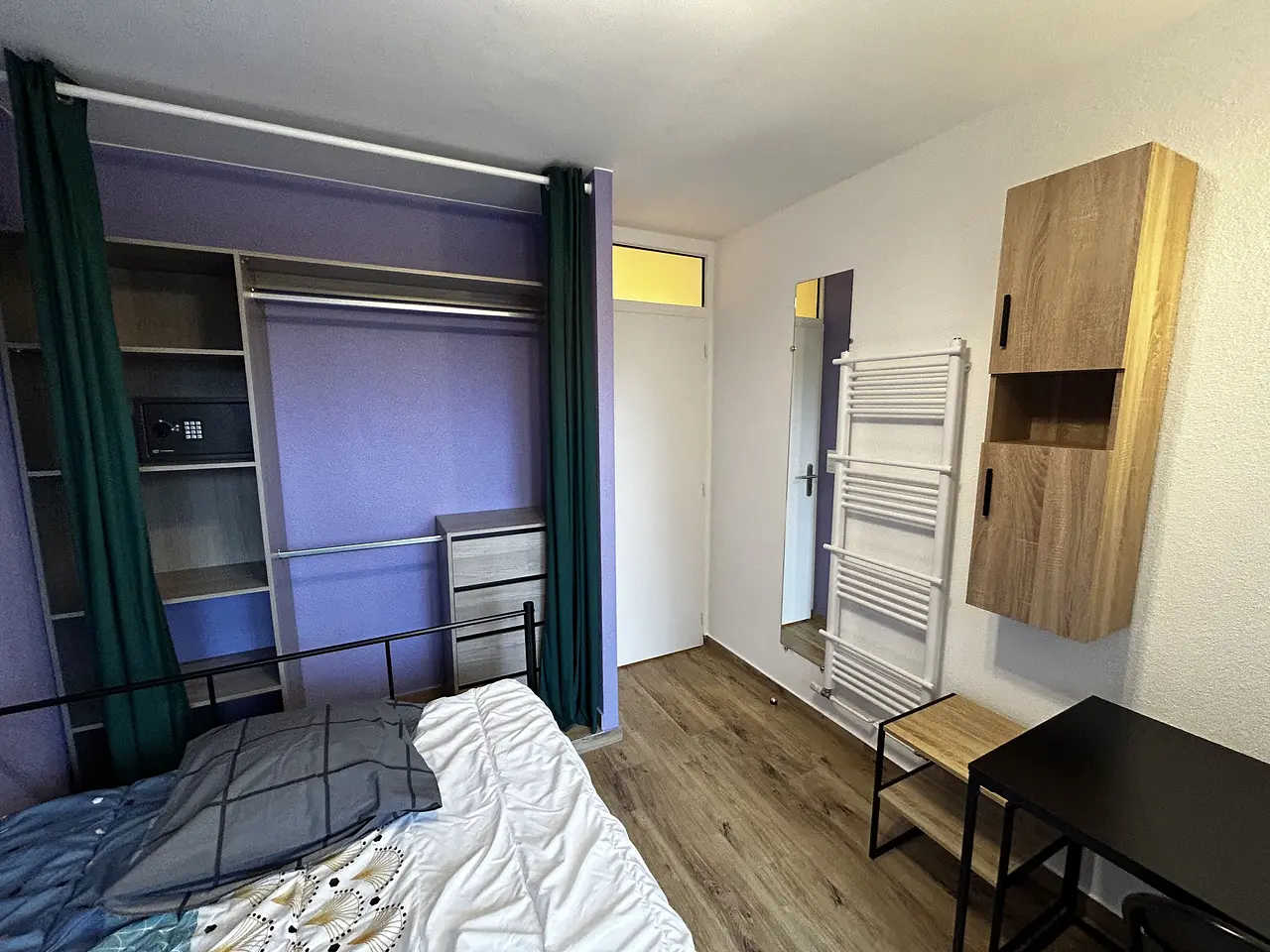 La chambre est louée avec un bureau, un lit, un évier et une penderie. Un accès à un balcon partagé avec une autre chambre est également possible depuis la chambre.
