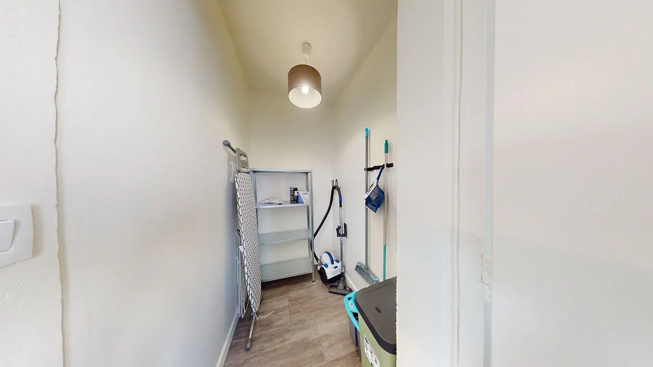 Un cellier attenant à la cuisine offre un espace de rangement supplémentaire, et des placards dans le couloir complètent les espaces de stockage.