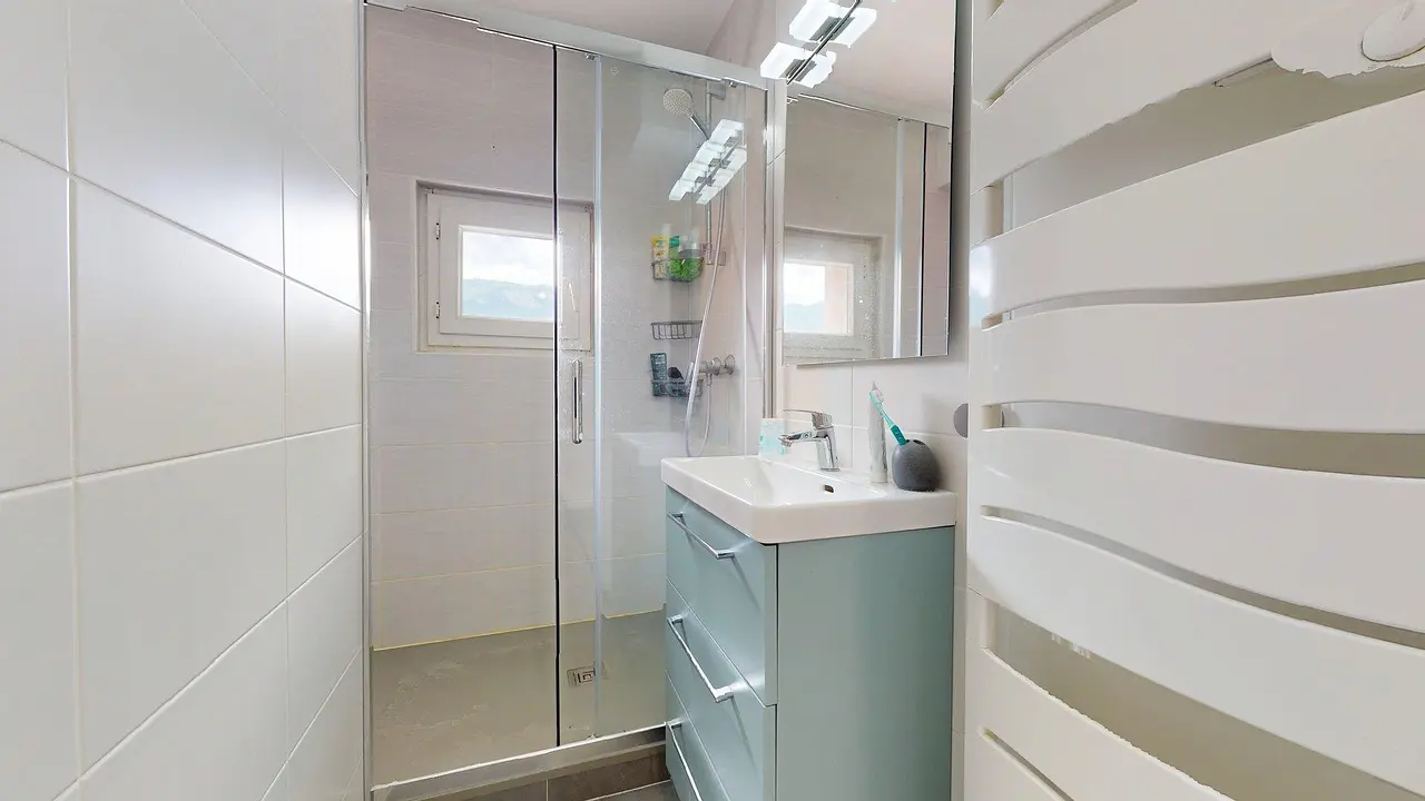 La salle d'eau dispose d'une grande douche, d'un meuble vasque avec un miroir ainsi que d'un sèche-serviettes. Les toilettes sont séparées.