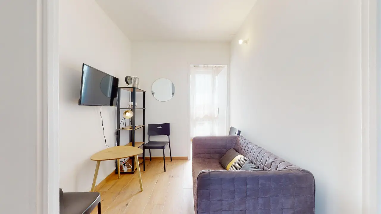 Le salon est meublé d’un petit canapé ainsi que d’une TV murale, une table basse et un meuble étagère.