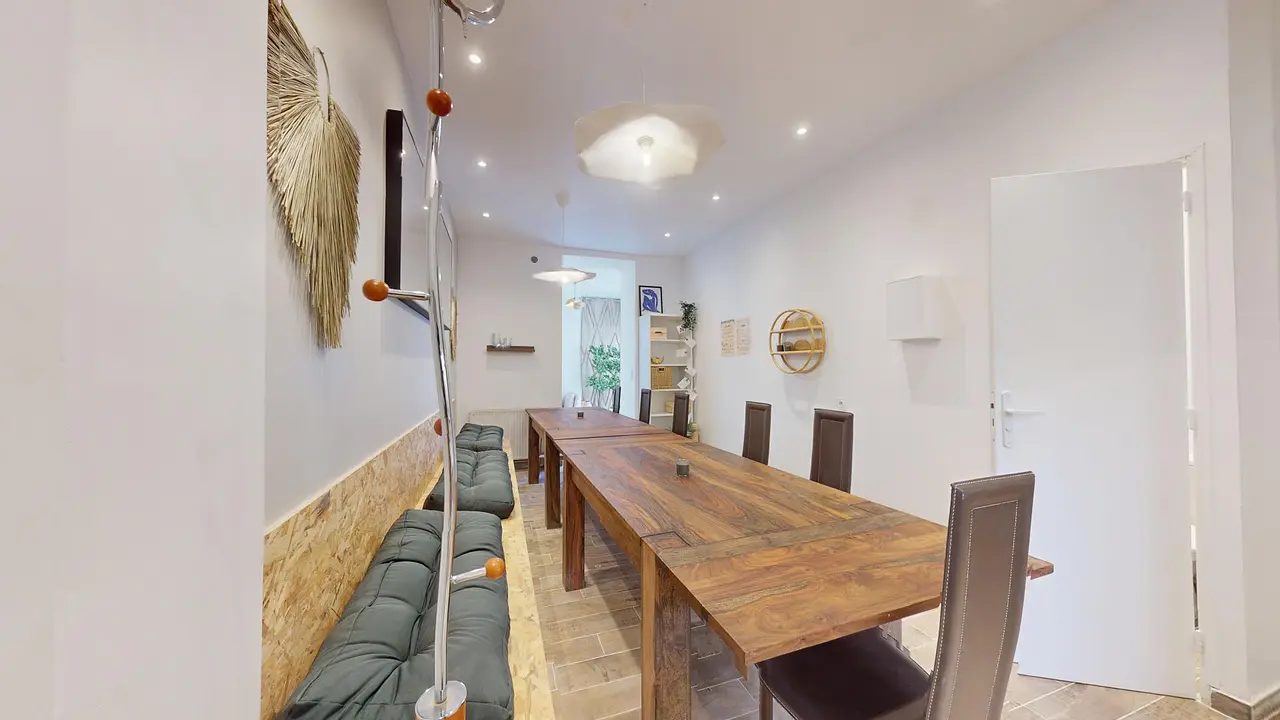 La maison s'ouvre sur la salle à manger, haute de plafond, équipée de grandes tables en bois pour des repas conviviaux dans l'esprit d'un gite. L’espace séjour se poursuit ensuite vers un salon lumineux, avec la grande baie vitrée, qui dispose de deux canapés et d'un espace coworking donnant sur le patio, prolongée d'un bureau fonctionnel pouvant accueillir deux personnes.