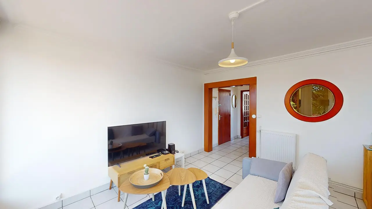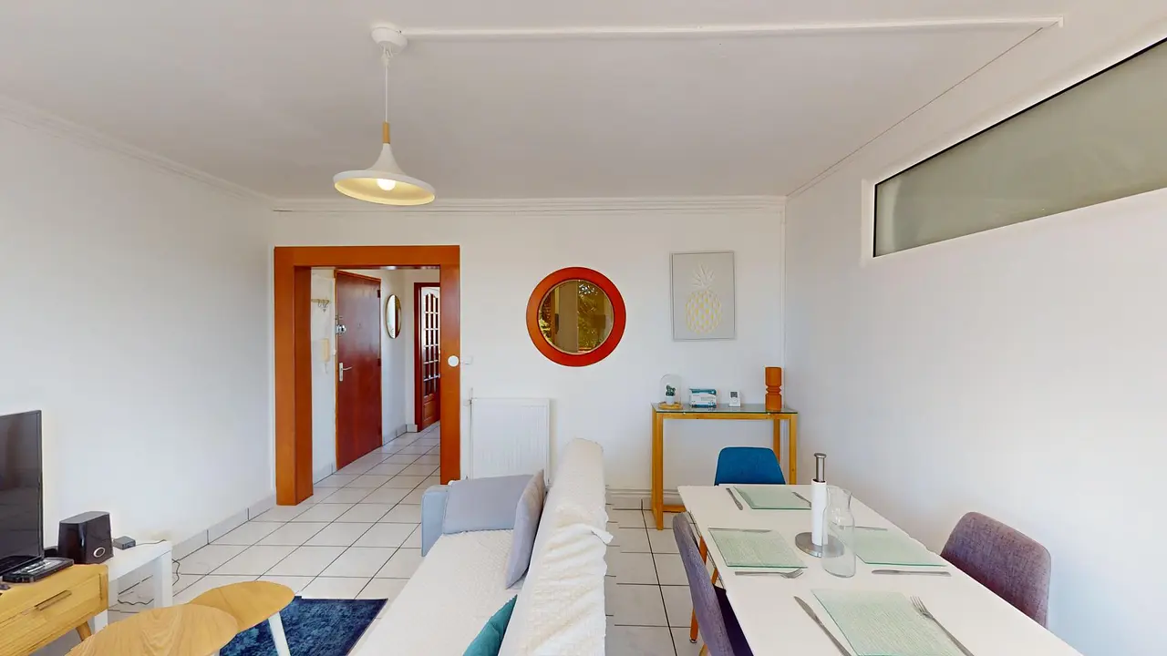 L'appartement s'ouvre sur une entrée avec rangements desservant un lumineux séjour. Celui-ci dispose d'un canapé, de tables basses, d'un meuble TV avec TV, d'une table avec 4 chaises et des rangements.