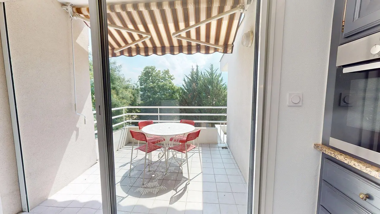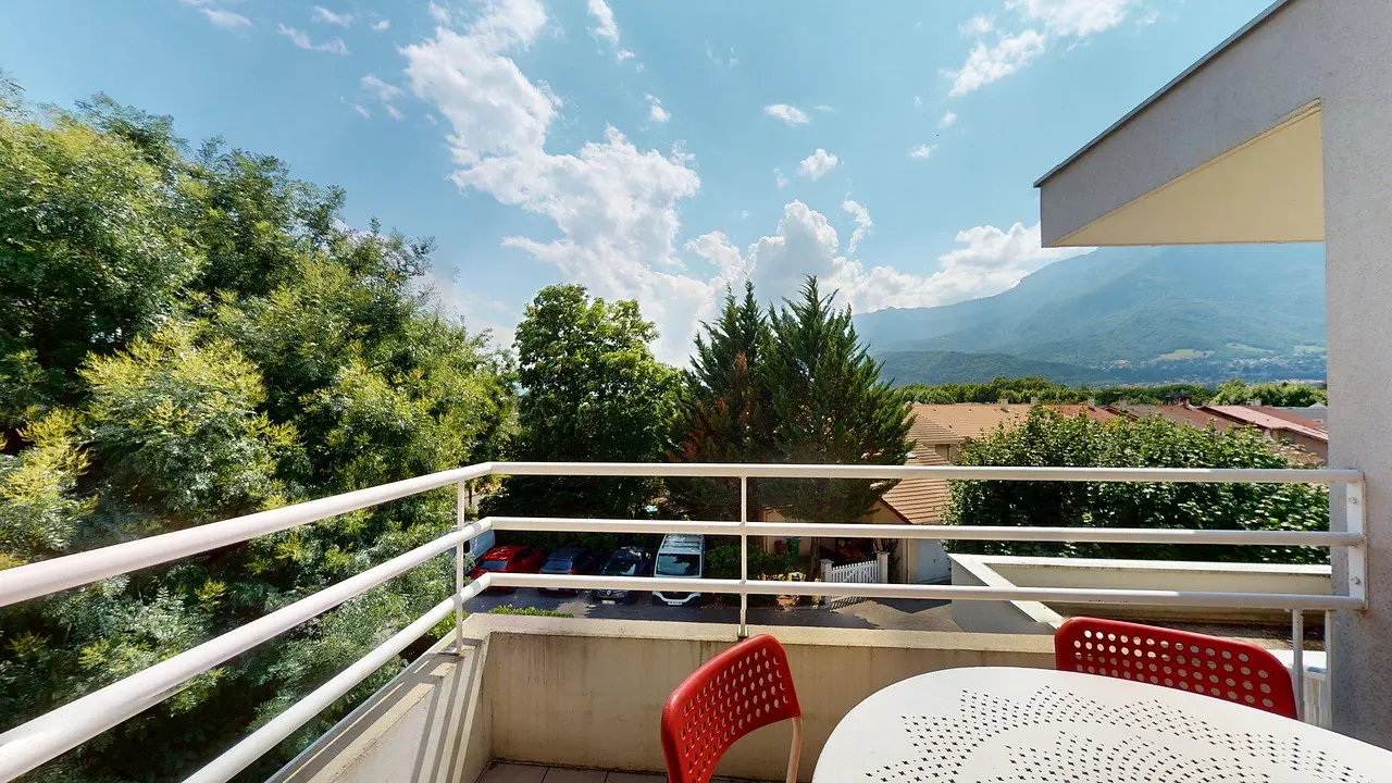 La pièce de vie est meublée avec un canapé, un fauteuil, table basse et une table à manger pouvant accueillir 4 personnes. Le séjour s'ouvre sur un balcon équipé d'une table et de 4 chaises.