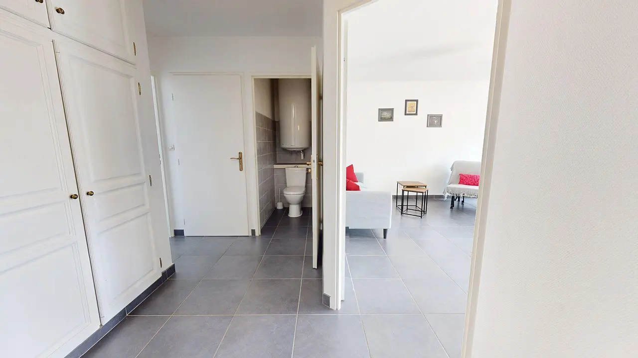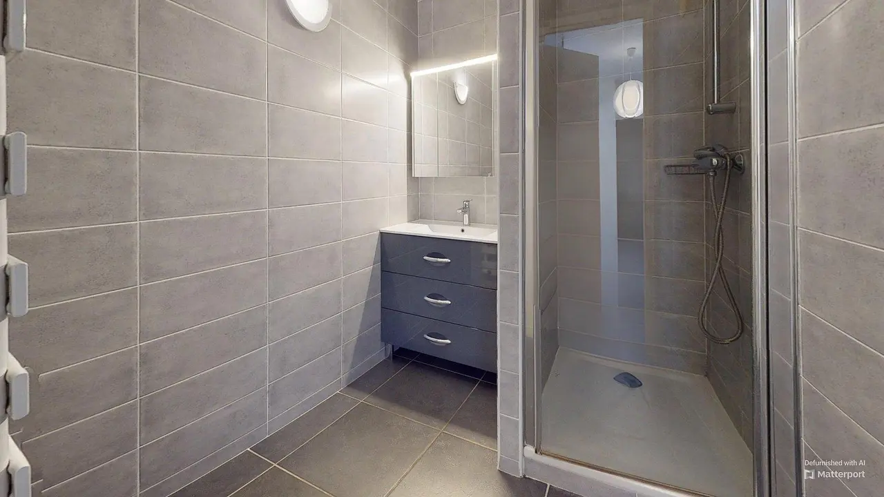 La salle d'eau comporte une douche, un meuble vasque avec miroir, sèche-serviette ainsi que des rangements. Les WC sont séparés pour plus de confort.