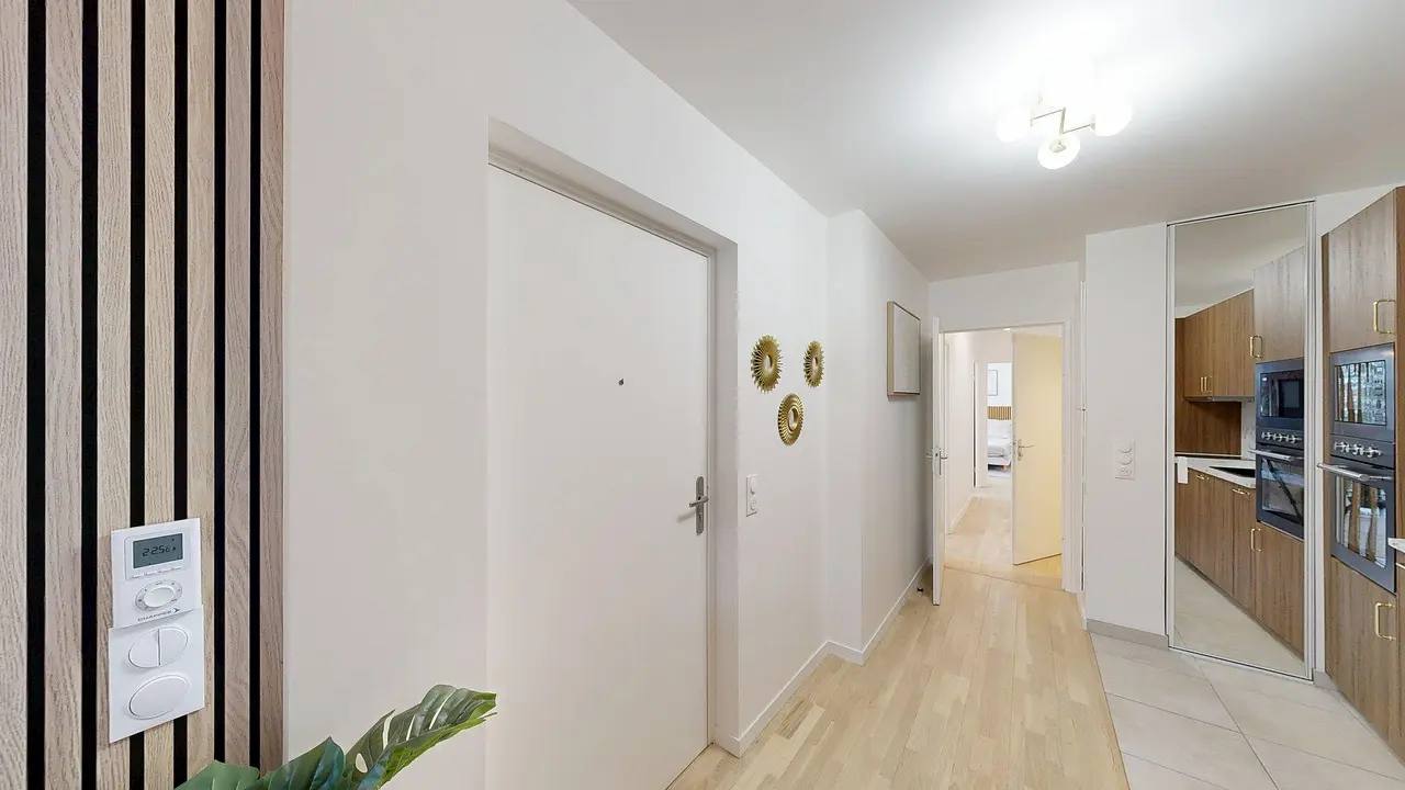 L’espace de vie se distingue par une décoration contemporaine et des équipements de haute technologie. La cuisine, véritable cœur de l’appartement, est entièrement équipée avec des plaques de cuisson, un four, un micro-ondes, un réfrigérateur et un lave-vaisselle. Pour votre confort, une buanderie complète avec lave-linge et sèche-linge est également à votre disposition. La vie en communauté est facilitée par un salon chaleureux avec un canapé confortable et une télévision.