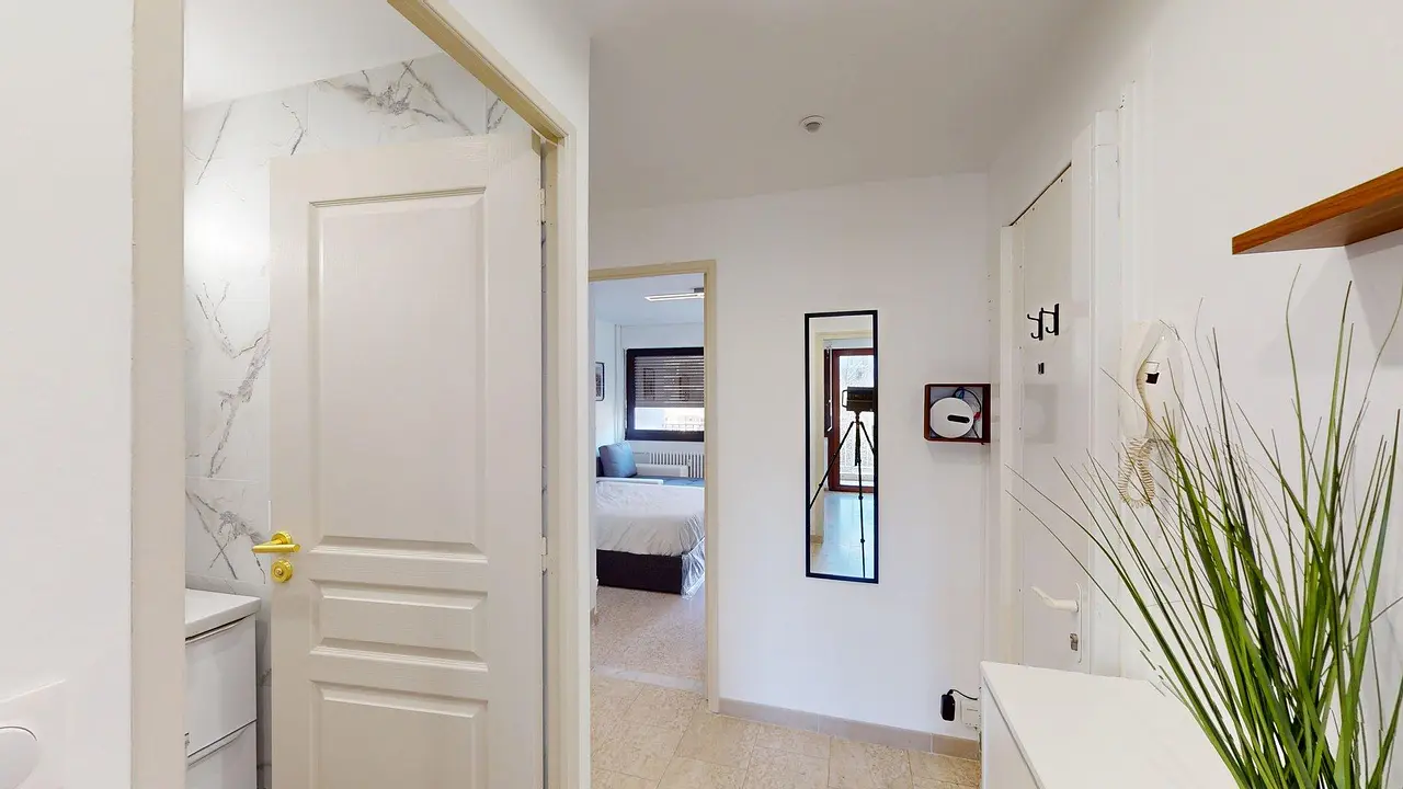 L’appartement s’ouvre sur une entrée fonctionnelle, équipée d’un meuble à chaussures, parfaite pour l’organisation. Un petit dégagement avec commode et placards de rangement permet de stocker vestes et effets personnels. Les WC sont séparés et disposent d’un meuble vasque avec point d’eau, un confort appréciable au quotidien.