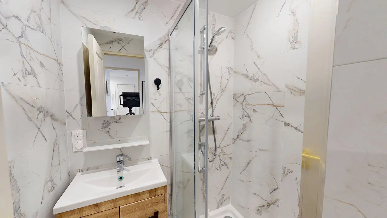 La chambre 2 dispose d’un lit double, d’une table et d’une lampe de chevet, d’un meuble de rangement, d’une banquette, d’un placard ainsi que d’un bureau avec chaise. Elle bénéficie d’un balcon ouvert, idéal pour profiter de l’extérieur, et dispose en plus d’une salle d’eau privative avec douche, un véritable confort en colocation 🚿.