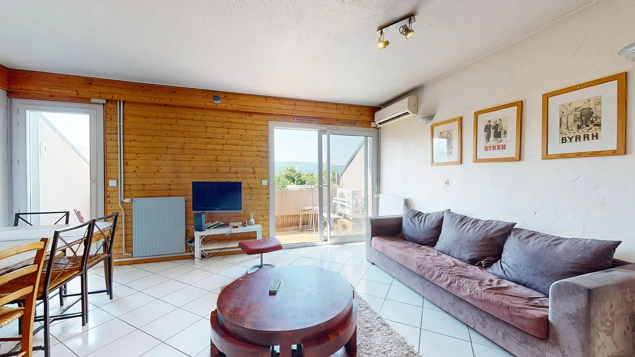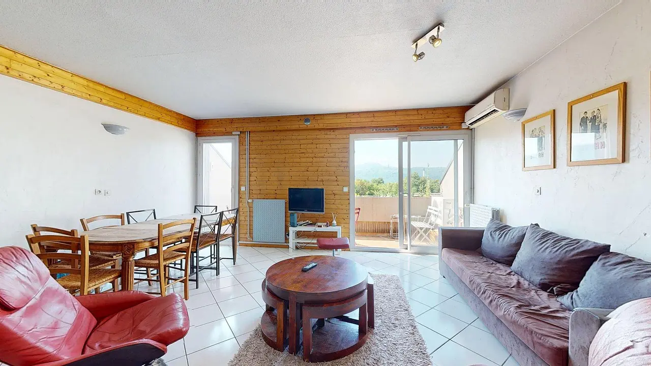 La pièce de vie est meublée avec un canapé, une table basse, un meuble TV avec TV, deux fauteuils, une table avec 8 chaises. Le séjour donne sur un balcon avec du mobilier de jardin.