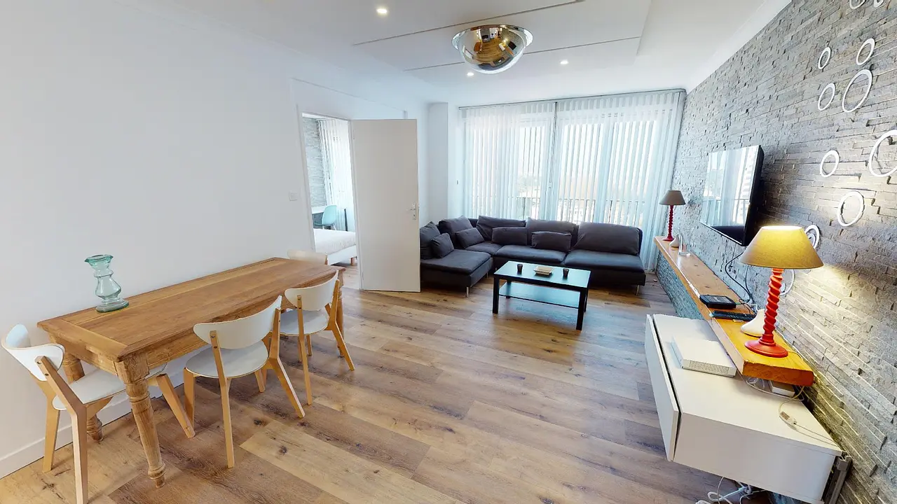 Grand salon lumineux aménagé (canapé d’angle, cheminée, TV, ne table à manger, etc)