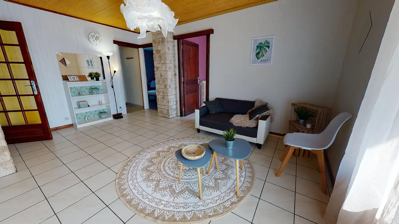 Superbe colocation de 3 chambres de 66m2 située au 20 Avenue Jacques Duclos à Vénissieux. Cette colocation, rénovée durant l’été 2021, se compose d’un grand salon lumineux avec canapé, table basse, rangements et table à manger, idéal pour partager des repas.