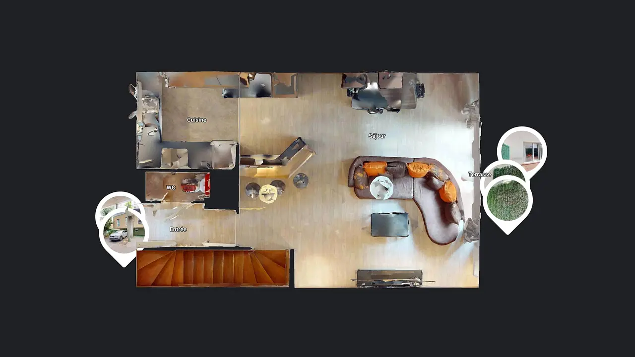 La maison s'ouvre sur une entrée avec rangements desservant un grand séjour avec cuisine ouverte. Celui-ci dispose d'un canapé, d'une table basse, d'un meuble TV, d'une TV et d'une table avec 4 chaises.