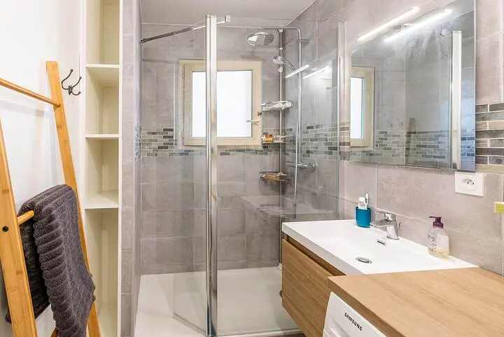 Une salle d'eau avec une douche, un meuble vasque, un miroir et des rangements vient compléter ce logement