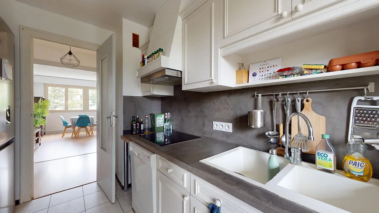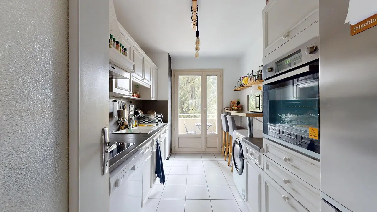 Une cuisine équipée d'un réfrigérateur, de plaques de cuisson, d'une hotte, d'un four, d'un four micro-ondes, d'une machine à café et de nombreux rangements. Une porte-fenêtre menant sur le balcon apporte de la clarté à cet espace.