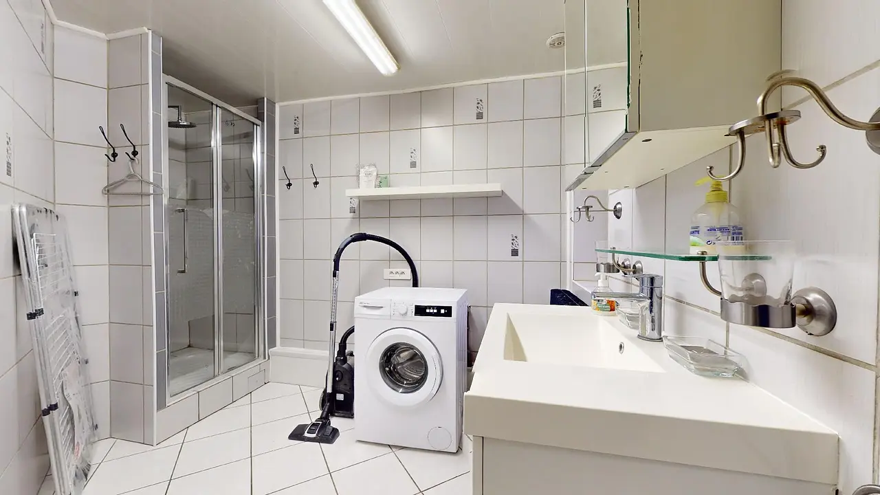 L'appartement est réparti sur trois niveaux. Au rez-de-chaussée, vous découvrirez une petite cour et toutes les pièces communes, notamment le salon/salle à manger. Ce dernier est aménagé avec une table et six chaises, un canapé d'angle, deux petites tables gigognes, une étagère, une télévision et son meuble. La cuisine est équipée d'une table haute, de trois tabourets, de plaques de cuisson, d'une hotte, d'un four encastré, d'un four à micro-ondes, d'un réfrigérateur, d'une machine à café et d'un évier. En traversant la cuisine, vous accéderez aux toilettes et à la première salle de bain qui est équipée d'une douche, d'une machine à laver et d'un meuble vasque.