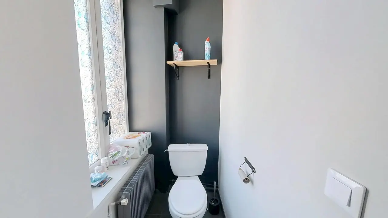 La salle d’eau comprend une douche, un meuble vasque avec miroir, un lave-linge et des rangements pratiques. Les WC sont séparés pour un meilleur confort au quotidien.