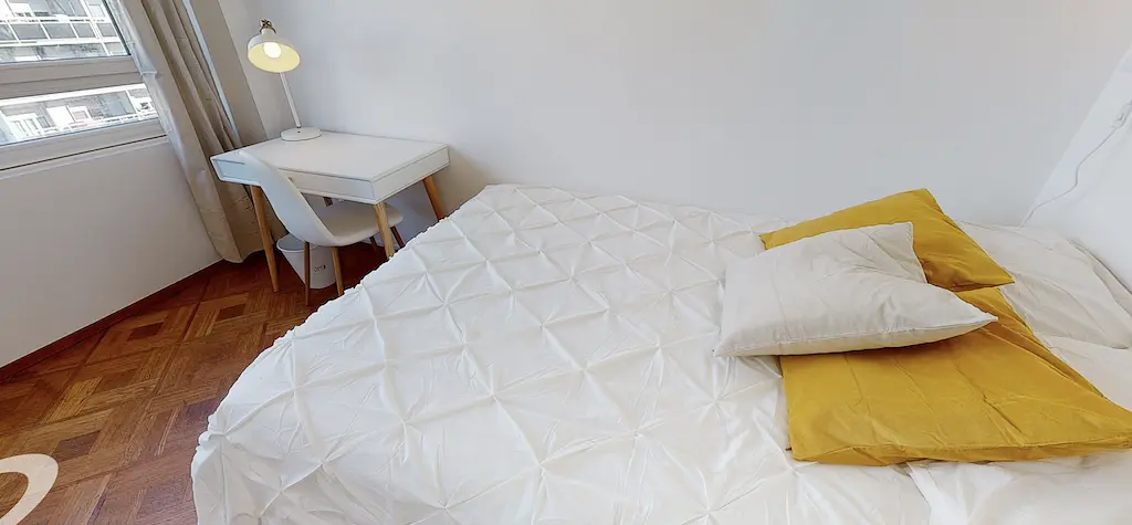 La chambre 4 est à droite de la porte d'entrée, elle est meublée d’un lit double, d’un bureau avec chaise, d'un meuble cube, d'un grand placard mural pour ranger ses affaires. La chambre est très lumineuse car elle a une grande fenêtre.