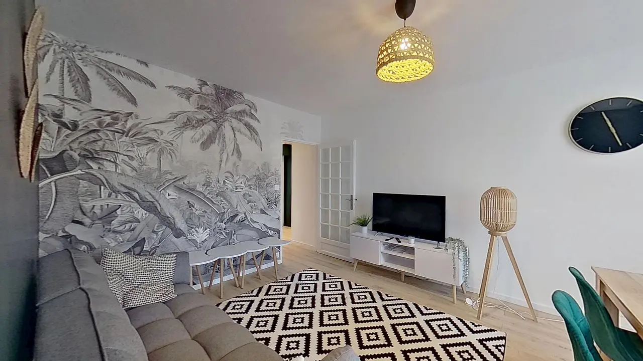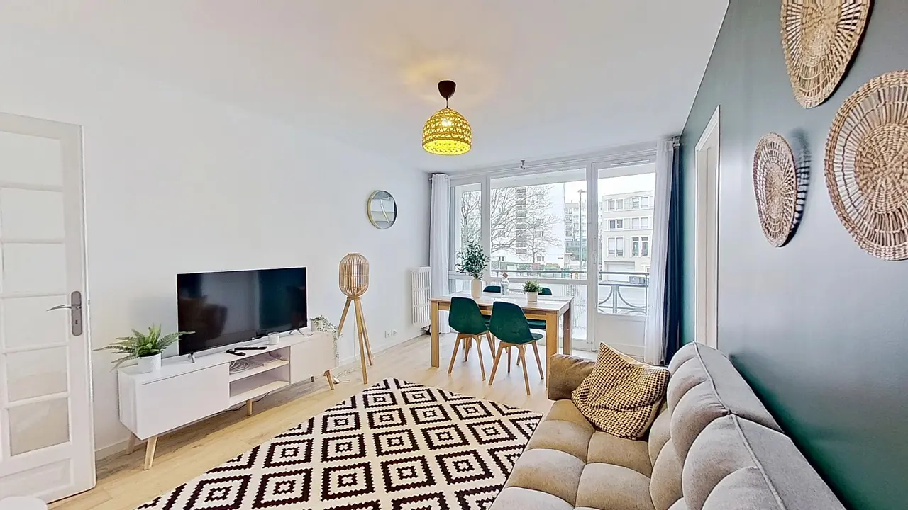 La pièce de vie est meublée avec un canapé, une table basse, un meuble TV ainsi qu'une télévision et une table à manger. Elle dessert également sur un balcon qui vous fera gagner en confort et en espace.