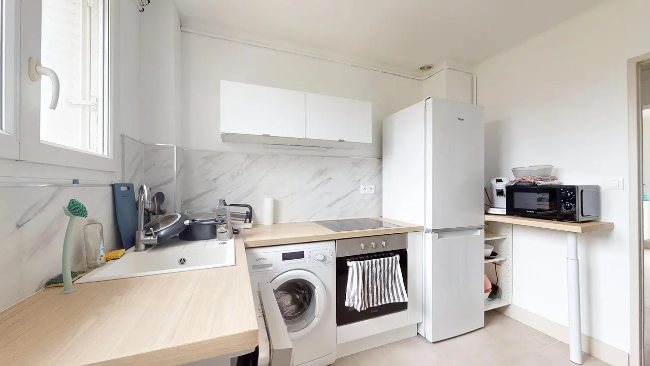 La cuisine séparée est entièrement équipée (four, micro-ondes, plaques, hotte, évier, frigo-congélateur, lave-vaisselle et machine à laver), complétée par des espaces de rangement et des petits plus (bouilloire, machine à café, toaster) pour faciliter votre quotidien !