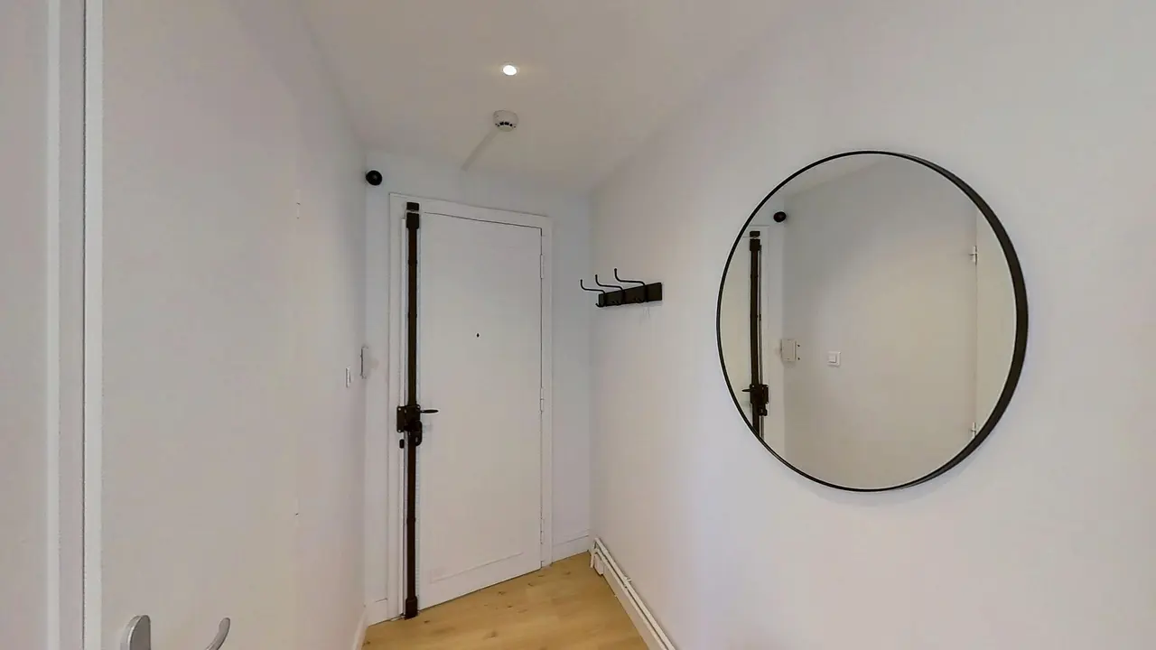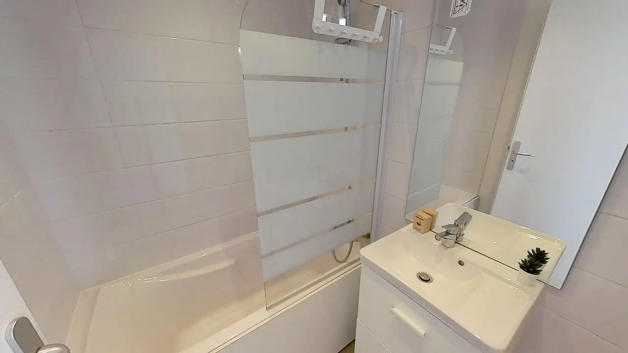 La salle d'eau comporte une baignoire avec pare-douche, un meuble vasque avec miroir, ainsi que des rangements. Un WC séparé complète les parties communes.