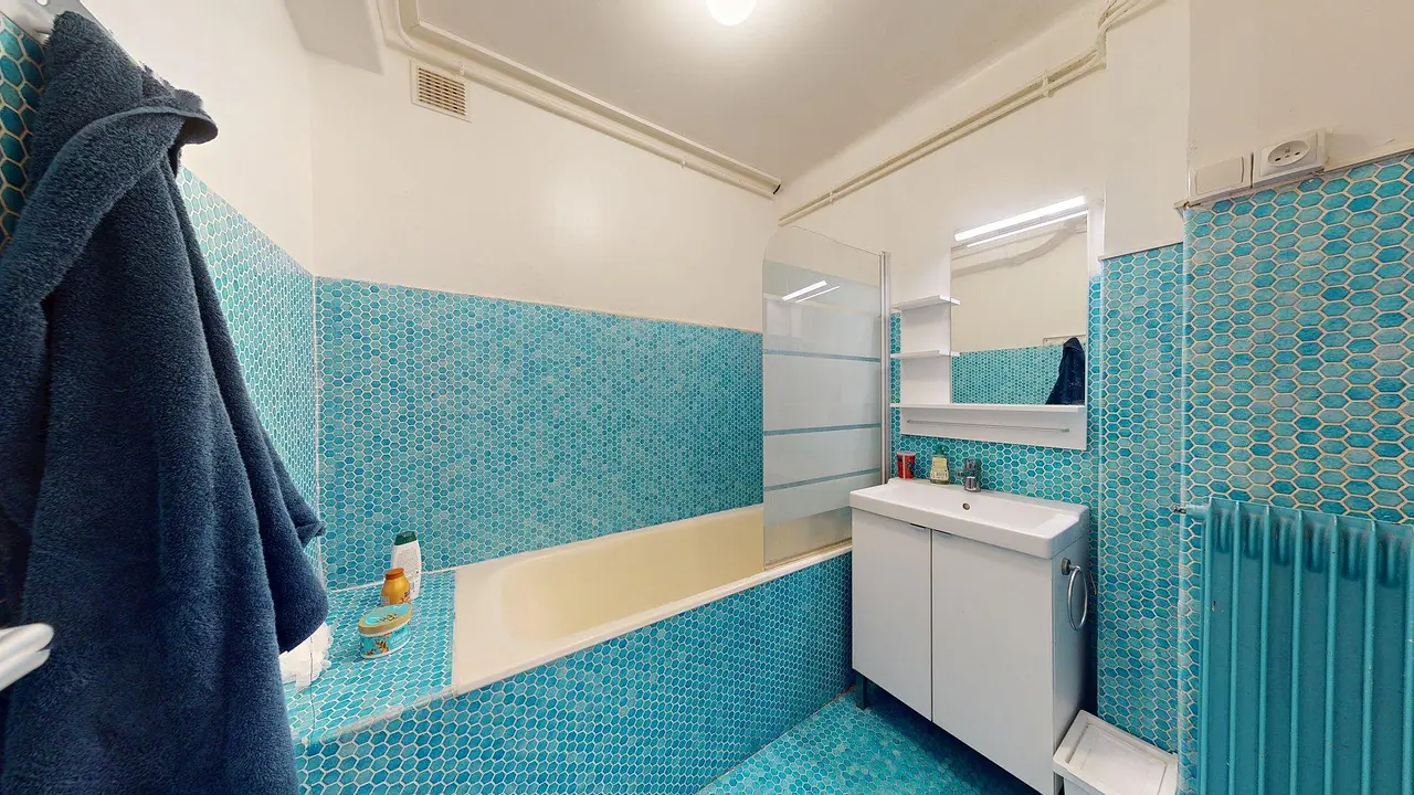 La salle de bain, équipée d’une baignoire et d’un meuble vasque récent, présente un carrelage bleu rétro qui lui donne un charme unique. Les WC sont séparés.