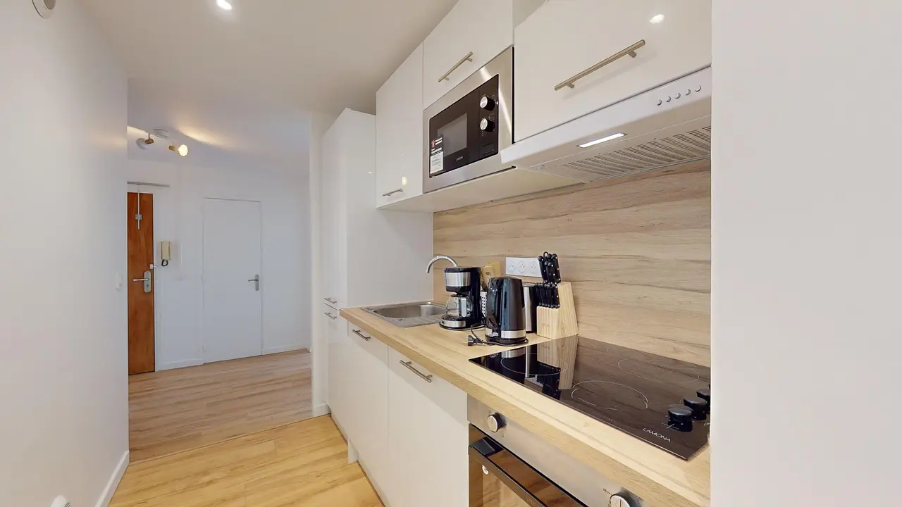Une cuisine équipée avec plaques de cuisson et hotte, four et micro-ondes encastrés, toasteur, bouilloire et machine à café filtre ainsi que rangements et ustensiles de cuisine.