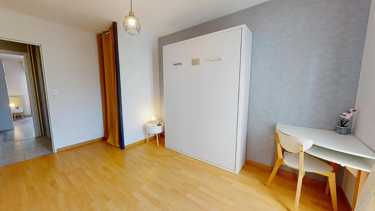 Cette chambre dispose d'un lit placard double literie ce qui rend la chambre encore plus spacieuse. Un bureau avec chaise, une table de chevet avec lampe et une armoire dont également à disposition.
