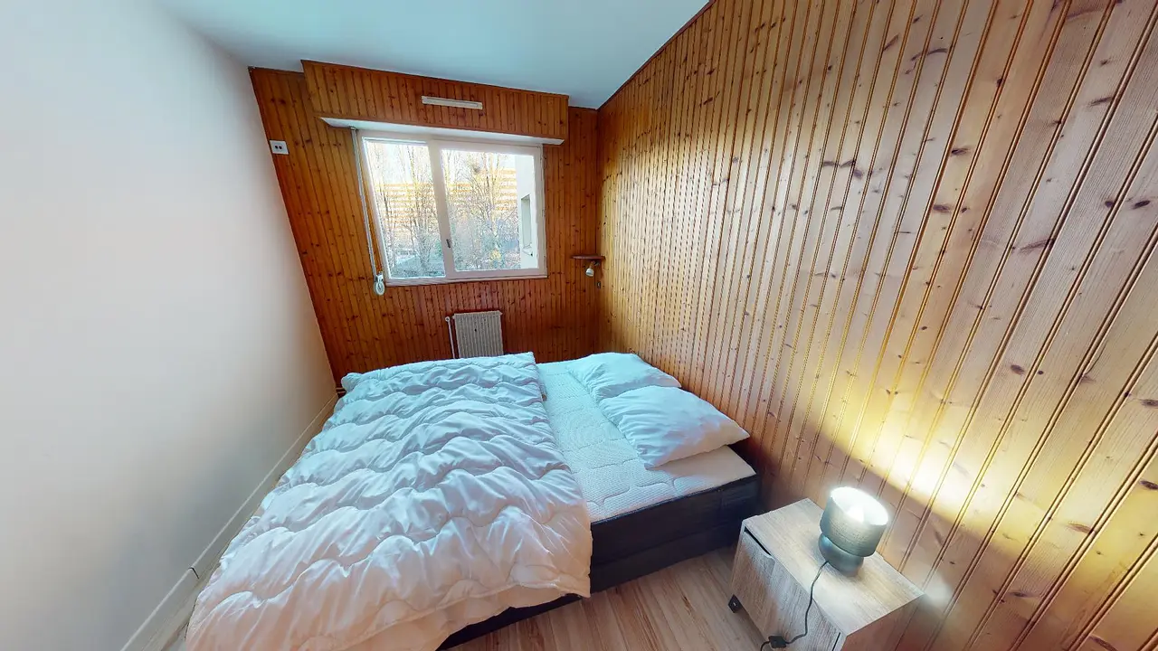 Cette chambre est meublée avec lit double, bureau et placard de rangement