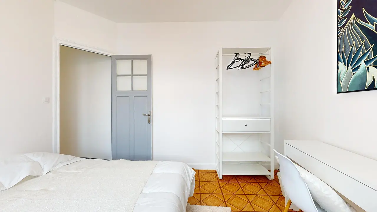 Cette chambre de 11 m² dispose d'un lit double, d'une table de chevet, d'un bureau avec une chaise et de rangements. Le couloir menant à cette chambre peut être destiné à un espace à usage exclusif de l'occupant (exemple : espace de rangement chaussures).