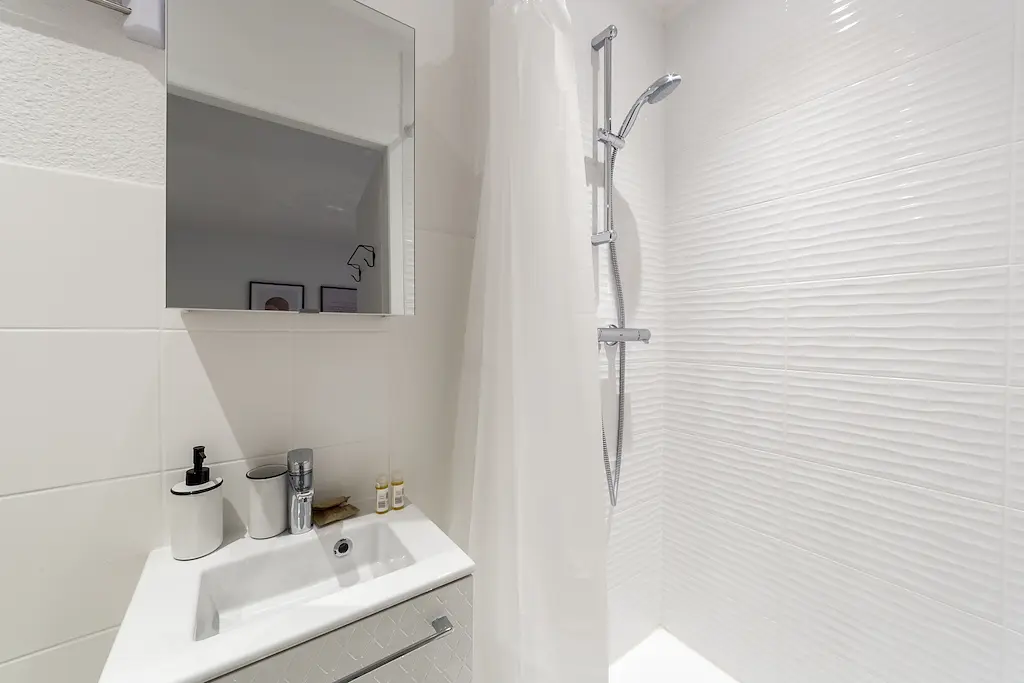 Son intérieur offre une chambre équipée d'un lit ainsi que d'une penderie, une cuisine et une salle de bains avec douche et meuble vasque.