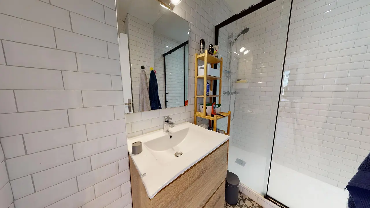 Une salle de bain avec une grande cabine de douche et meuble vasque ainsi que des WC séparés viennent compléter ce logement.