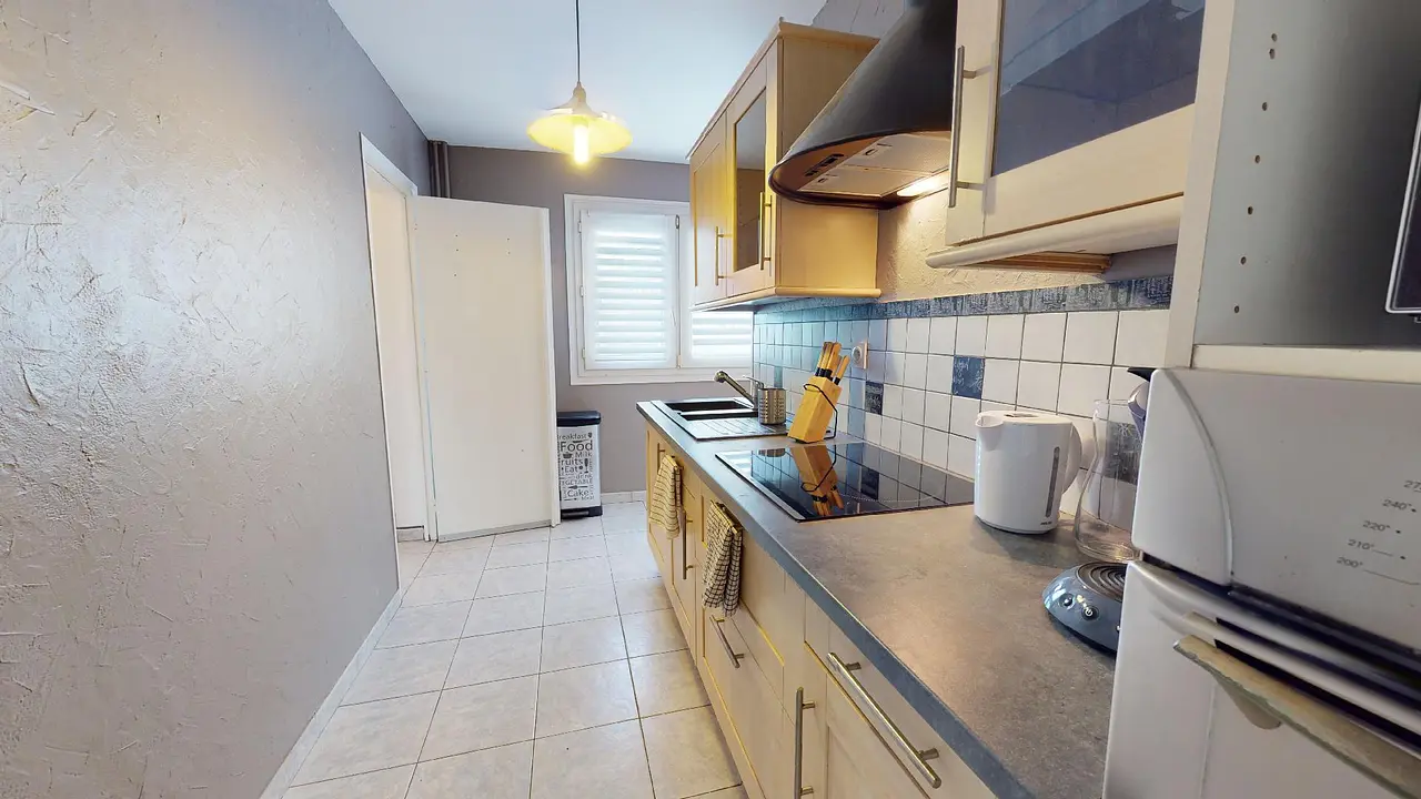 La cuisine est équipée d'un réfrigérateur avec congélateur, un double évier, des plaques de cuisson avec une hotte, une bouilloire, une machine à café, un micro-ondes, un four, une machine à laver ainsi que de nombreux rangements. Une table avec un banc d'angle et un banc individuel sont également à disposition, idéal pour partager des repas entre colocataires.
